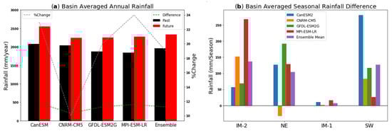 (a) The comparison of basin average annual rainfall (mm/year) between past and future climate and percentage changes (%) for each selected GCM; and (b) basin average seasonal rainfall differences (future—past) for selected GCMs and the ensemble mean.