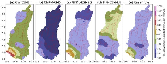 As stated earlier, rainfall in Sri Lanka is influenced mainly by seasonally varying monsoon systems and their interactions with the island’s topography, and thus the elevated regions receive more rainfall. Figure 5a–e compares the spatial distribution of changes in annual average rainfall for the GCMs and their ensemble mean. All four models indicate that the southern hilly region of MRB will very likely receive more rainfall in the upstream area under the future warmer climate.