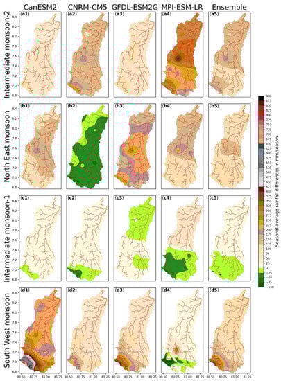 To understand the seasonal changes in rainfall, the spatial distribution of seasonal climatology differences was calculated and is shown in Figure 6. The basin average seasonal rainfall changes are shown in Figure 4b. Rainfall changes during two major seasons (i.e., NE, and SW monsoons) will be discussed first. As shown in Figure 6b1–b5, during the NE monsoon, three models except for CNRM-CM5 project an increase in rainfall, and the basin average changes are ~100–200 mm more or less uniformly throughout the basin.