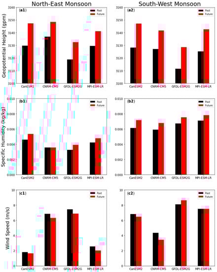The comparisons of past and future climate seasonal average of variables influencing rainfall: (a1,2) geopotential height, (b1,2) specific humidity, and (c1,2) wind speed.