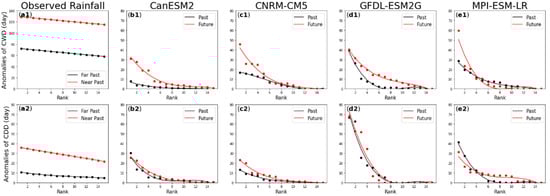 Figure 11a1–d1 shows the first 20 peak discharges estimated by the WEB-RRI model for the inputs from CanESM2, CNRM-CM5, GFDL-ESM2G, and MPI-ESM-LR, respectively. As shown in the figures, the projected future peak discharges are significantly higher in CanESM2 and MPI-ESM-LR and marginally higher in the other two models. Therefore, peak discharges are very likely to increase in the future; thus, hydrological floods are very likely to increase in the future climate in this basin. Similar findings were reported in the Assessment Report 5 of the IPCC, explaining that GCMs have projected the impacts associated with increased flooding with high confidence in the case of small islands [].