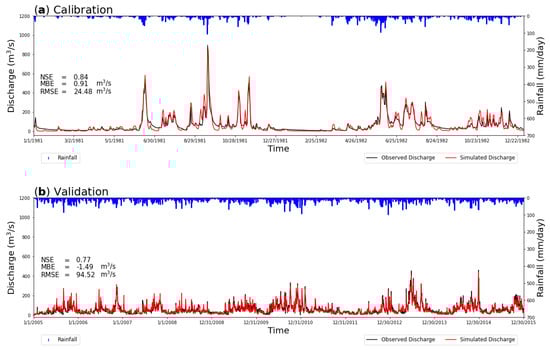 Performance metrics, Nash–Sutcliffe Efficiency Coefficient (NSE) [], Mean Bias Error (MBE), and Root Mean Square Error (RMSE), were used for the evaluation of model performance and other assessment purposes.