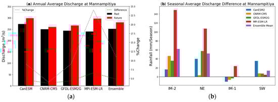 (a) Annual average discharge at Mannampitiya gauging station of the selected models; and (b) seasonal average discharge difference at Mannampitiya gauging station of the selected models.