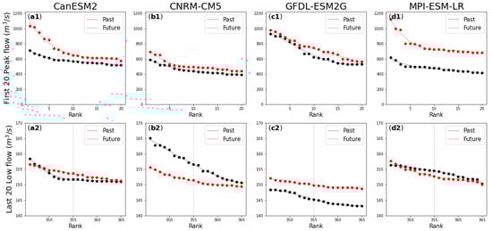 First 20 peak-flow events and the last 20 low-flow events of daily average discharge values of the past and future 20 years of the selected GCMs: CanESM2 (a1,2), CNRM-CM5 (b1,2), GFDL-ESM2G (c1,2), MPI-ESM-LR (d1,2).