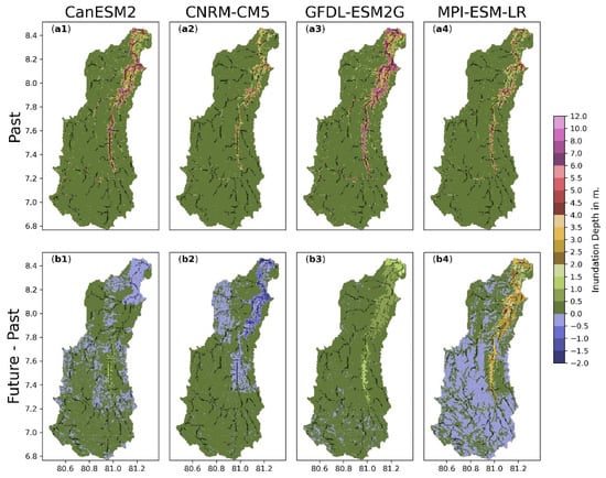 (a) Past all-time inundation depth; and (b) inundation depth deference between future and past of the selected GCMs: CanESM2 (a1,b1), CNRM-CM5 (a2,b2), GFDL-ESM2G (a3,b3), MPI-ESM-LR (a4,b4).