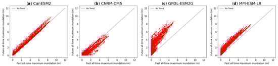 The difference between past and future climates in all-time maximum inundation depth at each grid cell was estimated from the WEB-RRI simulated inundation gridded data for each GCM individually and is plotted in Figure 12b1–b4, and the past all-time inundation depth gridded data are given in Figure 12a1–a4 for reference. As shown in the figure, except for the CNRM-CM5 model, the other three models project an increase in the inundation extent for all-time flood depth. Therefore, it is likely that the flood inundation area and risk will increase in the basin under the future climate. The contrasting behaviour of CNRM-CM5 can be attributed to the reduction in future rainfall due to a low warming rate and the reduction in rainfall during the NE monsoon, which brings a considerable amount of rainfall to the downstream area of the basin. To verify the simulation results further, the all-time seasonal (i.e., NE monsoon) maximum inundation depths simulated by the WEB-RRI model were estimated. Figure 13 shows the scatter plot of past versus future all-time seasonal maximum inundation depths during the NE monsoon for all the model grids. As shown in the figure, CNRM-CM5 projects a decrease in all-time seasonal inundation depth in the future climate compared with those in the past climate during the NE monsoon, whereas the other three models project clear increases in the future inundation depth. Therefore, this contrasting behaviour of a decreased inundation depth from CNRM-CM5 is due to uncertainties in rainfall projections during the NE monsoon season.