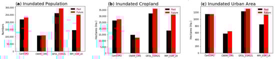 To understand the impact of climate change on the socio-economic features, the population data and land cover data were set into layers in GEE. Additionally, the past and future simulated inundation over 1 m in depth from WEB-RRI has been overlaid for each selected GCM, and the statistics of inundated population, cropland and urban area were extracted for analysis, as shown in Figure 14. The following results were obtained from the analyses: (a) it is very likely that flood damage to the population will increase; (b) it is likely that damage to the cropland will increase; and (c) inundation of urban area will likely increase in the future.