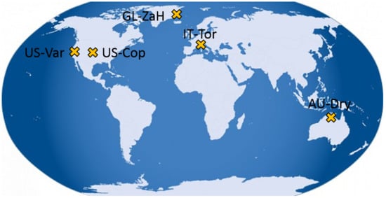 Five Eddy-covariance experimental sites have been selected as case studies. They belong to the global FLUXNET network (https://fluxnet.org/, accessed on 27 April 2021), which provides observational data of eddy covariance fluxes at different flux tower sites around the world. The chosen sites are: