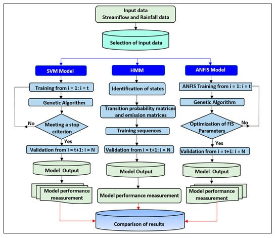 - Finally, the historical observed inflow data are compared with the forecasted inflow from HMM, SVM, ANFIS, hybrid SVM-GA, and hybrid ANFIS-GA models.