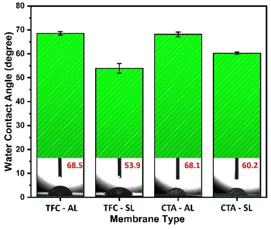 where Rj is the rejection rate of the membrane and J w is the water flux. The values of A and B presented in this paper were also reported in previous studies [26]. Wettability measurements and hydrophilic behaviour of the virgin Porifera TFC and FTS H 2 O CTA membranes were investigated by measuring the contact angle using the sessile drop method at various places on the same membrane, and it is measured using FACE Automatic Interfacial Tensiometer (Japan) [27]. Images of water contact angle measurement are represented in Figure 2. Surface morphology of the used and cleaned membranes for AL-DS direction was obtained using a scanning electron microscope (SEM, Zeiss Supra 55VP). In addition, SEM was performed to locate and analyse the fouling materials. SEM images were taken on fouled and washed membranes in both AL and SL. All the membranes were washed with deionized (DI) water and subsequently dried in a vacuum chamber before characterization. Zeta potential measurements were carried out for virgin Porifera TFC and FTS H 2 O CTA membranes using Malvern instruments. The wettability of membranes measures the wetting angle between the interface of the surface of the water and the outline of the membrane surface. The active layer (AL) of Porifera TFC and FTSH2O CTA membrane shows almost an equal water contact angle ~68.5 and 68.1, respectively, (Figure 2). As for the support layer, Porifera TFC showed lower water contact angle, ~53.9, than FTSH2O CTA membrane, ~60.2.