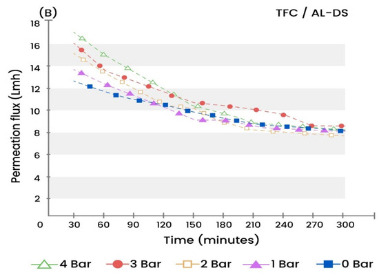 In the next set of experiments and under the same conditions, both types of membranes were tested with AL facing the DS and results are presented in Figure 4B and Figure 5B, respectively. These two graphs illustrated the profile of permeation flux in the FO and PAFO tests when the AL-DS mode was applied using TFC and CTA membranes. What is noticeable on a large scale is that a greater permeation flux was achieved in all experiments tested in the AL-DS mode in comparison with the AL-FS operating mode. According to Figure 4A,B, permeation flux in the TFC membrane tested in the AL-FS at 0 bar feed pressure was 7.4 Lmh. In contrast, permeation flux was 12.4 Lmh in the membrane tested in the AL-DS. Permeation flux increased by 67% by altering the membrane mode from the AL-FS to the AL-DS, indicating that more permeation flux and dilution of the brine reject DS was achieved. For the PAFO process at 4 bar feed pressure using TFC membrane, the permeation flux in the Al-FS direction was 14.9 Lmh while it was 16.7 Lmh in the PRO mode, recording more than a 12% increase in the permeation flux after changing the membrane orientation. For the CTA membrane at 0 bar, there was a 29% increase in permeation flux by altering the orientation of the membrane from the AL-FS to the AL-DS mode (Figure 5A,B). In contrast, there was 34% more permeation flux in the CTA membrane operating at 4 bar due to altering the orientation from the AL-FS to the AL-DS mode. The results are compatible with previous studies in which FO membrane operating in the PRO mode exhibited greater permeation flux; there was an agreement in these studies that CP is lower and more controllable in the AL-DS mode [17,18,29,30,31].