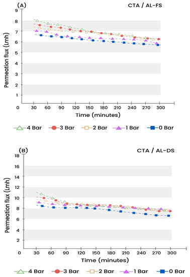 Figure 5. Change of permeation flux with time at different applied pressures using CTA membrane, (A) AL-FS and (B) AL-DS orientations.