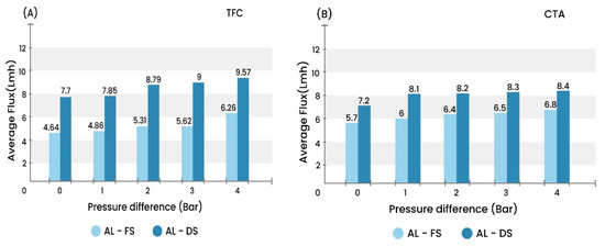 Figure 6. The average membrane flux calculated at different applied pressures of FO process using (A) TFC membrane and (B) CTA membrane in both orientations, AL-FS and AL-DS.