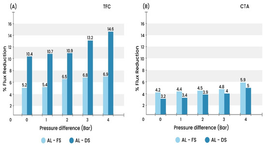 Similarly, for the CTA membrane, Figure 7B shows that permeation flux reduction was greater at 4 bar feed pressure. In contrast, the TFC membrane exhibited a greater reduction in the permeation flux in comparison with the CTA membrane (Figure 7B). The highest recorded permeation flux reduction was 5.9% in the FO mode operating at 4 bar feed pressure; this is about 15% less than the reduction in the permeation flux in the TFC membrane tested under the same working conditions. The decline in the permeation flux in the CTA working in the AL-DS direction was three times less than that recorded in the TFC membrane under the same operating conditions. On the contrary, CTA membrane demonstrated a lower decline in the permeation flux when it was tested in the AL-DS direction. For example, the reduction in the permeation flux at 0 bar feed pressure was 3.2% in the AL-DS direction and 4.2% in the AL-FS direction. The corresponding results at 4 bar feed pressure were 5% in the AL-DS direction and 5.9% in the AL-FS direction.