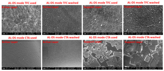SEM images (Figure 8) reveals that the CTA membrane is more responsive to cleaning by DI water than the TFC membrane. A notable change in the morphology of the active and the support layer of used and washed Porifera TFC and FTSH2O CTA membranes. For TFC membrane, cleaning with DI water achieved partial removal of fouling materials from the membrane active while it was less successful in the removal of fouling layer on the support layer side. Ineffective cleaning with DI water of the TFC membrane explains the high reduction of permeation flux after cleaning. In contrast, cleaning with DI water was more effective in washing the fouling layer off the surface of the CTA membrane. The latter showed little fouling materials left on the washed active layer, and fouling materials became sparse after washing. These results explain the lower reduction in the permeation flux of the CTA membrane obtained after washing.