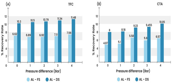 Figure 9. Recovery rate (%) of FO process at different applied pressures, using TFC membrane (A) and CTA membrane (B), in AL-FS and AL-DS orientations.