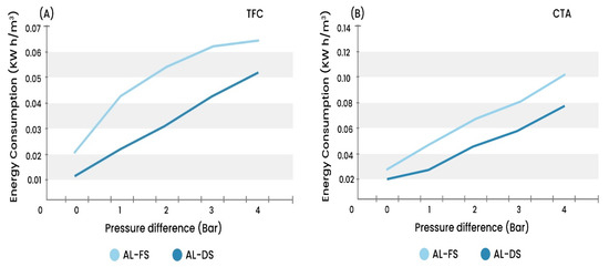 Figure 11. Energy consumption at different applied pressures, (A) using TFC membrane and (B) using CTA membrane.