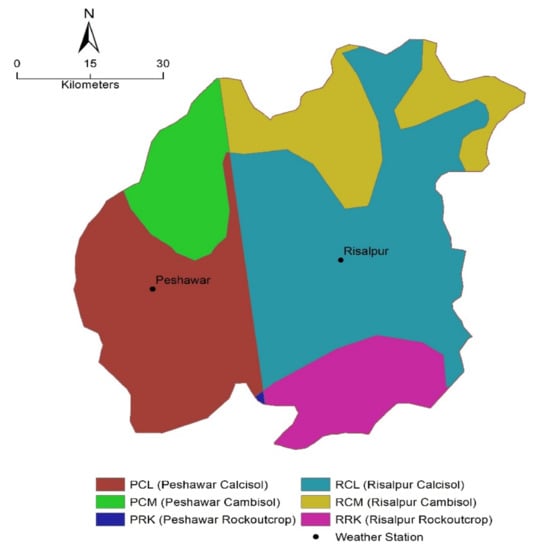 The basin was divided into two sub-regions using the Thiessen polygon method [56]; Peshawar meteorological station covers 35% of the area and the Risalpur station covers 65% of the area. There are three soil types in the basin, namely calcisols (65%), cambisols (25%), and rock outcrop (10%) [52]. Based on the soil types and climate conditions, the basin was further divided into six sub-regions by overlaying soil and climate maps. These sub-regions are Peshawar calcisol (PCL) 25%, Peshawar cambisol (PCM) 10%, Peshawar rock outcrop (PRK) 0.1%, Risalpur calcisol (RCL) 39%, Risalpur cambisol (RCM) 15%, and Risalpur rock outcrop (RRK) 10%, as shown in Figure 2.