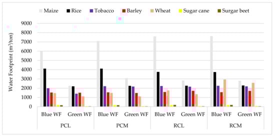 There were substantial differences in the blue and green WFs of crops in the sub-regions. For instance, the blue WFs of maize were 5982 m3/ton in PCL, 7100 m3/ton in PCM, 7602 m3/ton in RCL, and 7624 m3/ton in RCM, while the green WFs were 2256 m3/ton in PCL, 3093 m3/ton in PCM, 2830 m3/ton in RCL, and 2799 m3/ton in RCM. The WF of cambisols was high as compared to that of calcisols, and the reason could be the high organic content in cambisols (Figure 4).