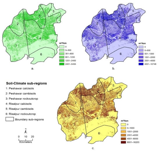 Spatial distribution of average annual green (a), blue (b), and total WF (c) of major crops in Peshawar Basin (1986–2015).