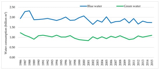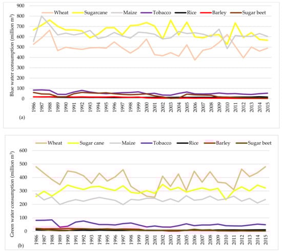 The results showed that wheat, sugarcane, and maize consumed a high amount of blue and green water as compared to tobacco, rice, barley, and sugar beet during the period 1986–2015, (Figure 5a,b).