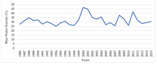 In this study, only irrigation from surface water was considered since groundwater irrigation is rare in the basin [48]. The annual average blue WF of crop production by surface water irrigation was estimated at 1.9 billion m3, which is around 31% of the available surface water in the basin (6 billion m3). The blue water scarcity over the period of 30 years varied from 25% in 1994 to 47% in 2000. The high scarcity recorded in 2000 was due to low flows in the river, see Figure 8. The thirty-year annual average scarcity was less than 50%, which was within sustainable limits and may be termed as low water scarcity [59] (Figure 8, Table 3).