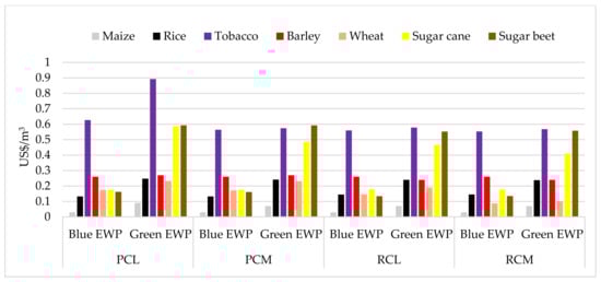 The blue and green EWP of maize and rice were similar in all sub-regions, except PCL. The blue and green EWP of tobacco slightly varied in different sub-regions but was highest in all sub-regions. Barley had the same blue EWP in all sub-regions, while the green EWP was high in PCL and PCM as compared to that in RCL and RCM. Wheat had the lowest blue and green EWP in RCM as compared to that in PCL, PCM, and RCL. Sugarcane had a similar blue EWP in different sub-regions, but different green EWPs. The green EWP of sugar beet was similar in PCL, PCM, RCL, and RCM sub-regions, while the blue EWP differed slightly in different sub-regions. In general, the results showed that the blue and green EWP of the soil type calcisol was relatively high as compared to that of the soil type cambisol since crops on cambisol have a higher WF than do those on calcisols.