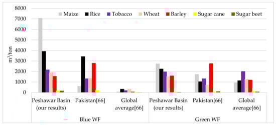 Comparison of the blue and green WFs of major crops in Peshawar Basin with those of the rest of Pakistan and the global average [66].