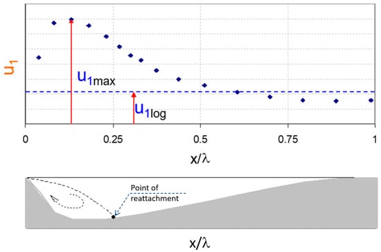 Figure 3 shows a typical spatial variation of u1 over one wavelength of a bedform. It is noted that u1 is spatially a continuous function and its value starts to increase downstream of the crest until it reaches a maximum value within the separation zone. After this point, u1 decreases downstream until it reaches its minimum near or over the crest. Figure 3 also compares the spatial variation of u1 as a function of distance x, and the corresponding value in the case of uniform flow over a flat bed, u1log, where the velocity profile can be assumed to be a logarithmic profile.