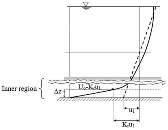The influence of the surface roughness of the bedform is presented in Figure 6b. It is shown that (for a given value of the water depth and the flow intensity) as the surface roughness increases, the near-bed velocity becomes smaller, resulting in a larger value of u1 (i.e., a smaller value of Uo/u1 or Kr). Thus, Kr can be related to the depth-to-roughness ratio, h/zo, via a linear correlation, Equation (19).