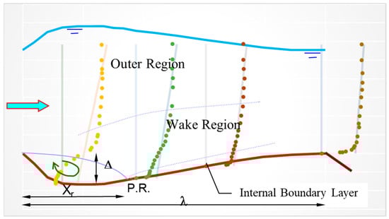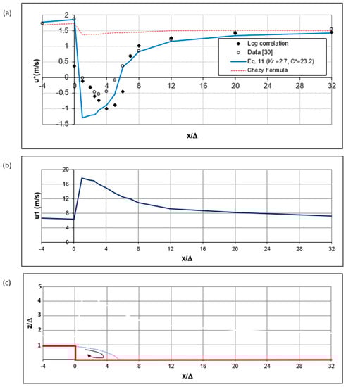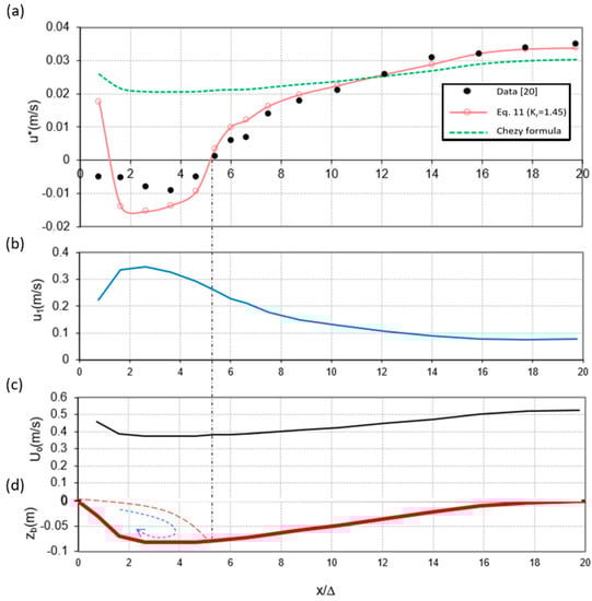 Figure 7a–c show the spatial variation of the bed shear velocity, u1 and Uo velocity fields for the case of low-regime shallow water flow over a train of fixed bedforms (Run 1 in Table 1). Figure 7d shows the typical geometry of one bedform with the circulation zone and the point of reattachment. The measurements (solid black circles) of the bed shear velocity were conducted by Van Mierlo and de Ruiter [] and are compared by the conventional Chezy formula (Equation (1)) and the new moment formula (Equation (11)).
