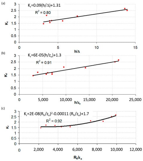 It should also be mentioned that some of the experiments were carried out in narrow channels and the ratio of the flume width to the water depth (b/h) ranged from 0.6 to 6. Accordingly, a side-wall correction might be required. One simple way to consider the side-wall effect is to use the hydraulic radius, Rh, instead of the water depth. In this case, the Kr–Rh/zo relation can be given as (Figure 6c)