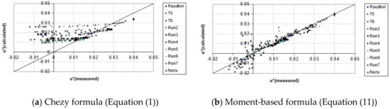 Figure 8a and Figure 8b present a comparison between the measured bed shear velocities and the predictions using Equations (1) and (11), respectively, for all the bedform experiments listed in Table 1. The new formula generally gives a good match with the measurements after the point of reattachment. Within the separation zone, the formula, on the one hand, seems to correctly produce the direction of the bed shear velocity but, on the other hand, generally over-predicts the shear velocity within the separation zone.