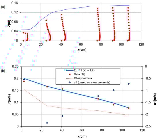 The new formula is also examined for predicting the spatial variation of the shear velocity for a near-bed water jet that is emerging and expanding downstream a free gate and forming a spatial hydraulic jump (S-jump). The full details of the laboratory experiment are found in []. Figure 10a shows the measured velocity profiles and water surface downstream of the jet outlet.