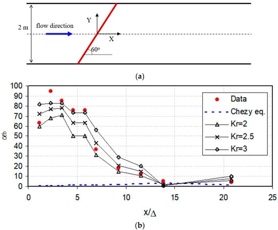 To estimate the calibration coefficient, Kr, Equations (18)–(21) were used, which gave values ranging between 2.0 and 3.6. Figure 11b shows the variation of the direction of the near-bed velocity obtained from LDA measurements downstream of the oblique step through the centerline of the flume []. Within the separation zone, the direction of the near-bed velocity is significantly different from the direction of the downstream flow by an angle of 60° or more. Figure 11b presents the predictions of the Chezy equation as well as the new formula (Equation (11)) for values of Kr ranging from 2 to 3. Using Equation (11) to get the near-bed velocity direction implicitly reveals an assumption that claims that the near-bed velocity direction is the same as the angle of the resultant bed shear stress. This assumption was found reasonable by Hasbo (1995), who found good agreement between the directions of the measured near-bed velocities via LDA and the directions obtained by the behavior of tufts attached to the bed.