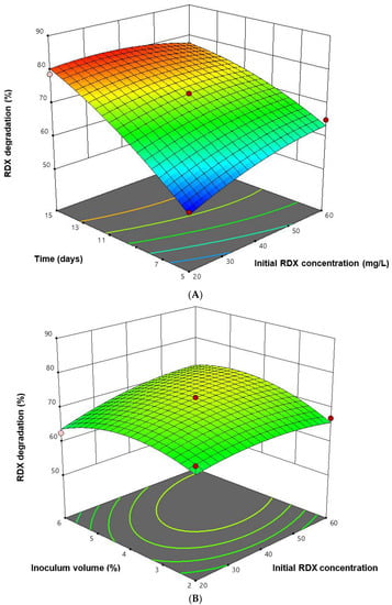 (A) 3-D model plot for the degradation of RDX under varying initial concentration (mg/L) and time (days) with Bacillus toyonensis. (B) 3-D model plot for the degradation of RDX under varying initial concentration (mg/L) and inoculum volume (%) with Bacillus toyonensis.