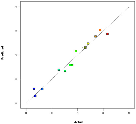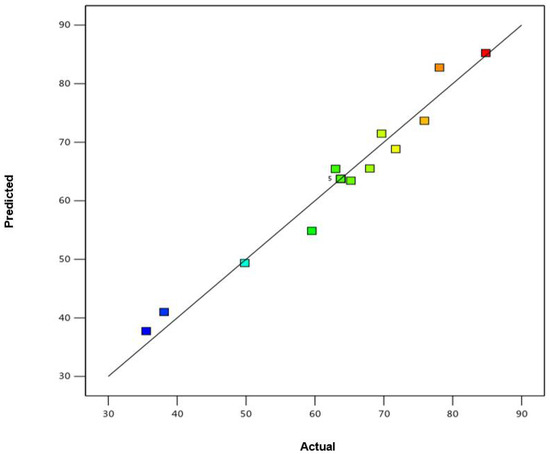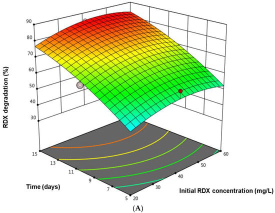 Degradation of RDX during the experiment can be observed in Figure 1A,B with Bacillus toyonensis (isolate No. WS4-TSB-3). The Maximum RDX degradation achieved with this microbe was 81.7 ± 1.3% with 40 mg/L initial RDX concentration and 6% inoculum volume on 15th day. This was followed by 78.7 ± 1.1 and 77.01 ± 0.8% RDX degradation at 20 mg/L and 60 mg/L, respectively with 4% inoculum volume on 15th day. Minimum degradation was 74.2 ± 0.3% achieved at 40 mg/L initial RDX concentration and 2% inoculum volume. Figure 1A shows the interactive effect of initial RDX concentration and time on RDX degradation. It was observed that, with increase in time, there was increase in RDX removal. However, at higher RDX concentration (60 mg/L) removal efficiency was much lower, which can be due to toxic effect of RDX on Bacillus toyonensis (isolate No. WS4-TSB-3). Figure 1B shows the interactive effect of inoculum volume and RDX concentration on RDX degradation. It was observed that Bacillus toyonensis (isolate No. WS4-TSB-3) showed increased removal of RDX with increase in inoculum volume. The whole set of data for RDX degradation with Bacillus toyonensis (isolate No. WS4-TSB-3) was subjected to two-way analysis of variance (ANOVA) as shown in Table 2. The p-value (0.0002), F-value (23.6) and R2 (0.9) of the model shows that the data was significant and best suited for the quadratic model. Figure 2 presents data between actual versus predicted value, which shows that there was less dispersion of data between experimentally obtained and predicted values by the model. Low standard deviation (2.2) was observed for the model, which confirms the suitability of the model. All the parameters were fitted for second order polynomial equation as follows: