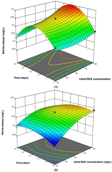 (A) Response surface plot (3-D plot) showing interactive effect of RDX concentration (mg/L) and time (days) on nitrite release with Bacillus toyonensis. (B) Response surface plot (3-D plot) showing interactive effect of RDX concentration (mg/L) and time (days) on nitrite release with Paenibacillus dendritiformis.