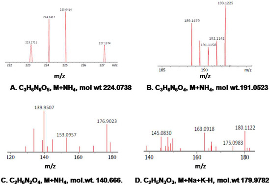 Mass Spectra of metabolites formed during RDX degradation. (A) Hexahydro-1-nitroso-3,5-dinitro-1,3,5-triazine (MNX, C3H6N6O5, M+NH4, mol. wt. 224.07), (B) Hexahydro-1,3-dinitroso-5-nitro-1,3,5-triazine (DNX, C3H6N6O4, M+NH4, mol. wt. 191.05), (C) Bis(hydroxymethyl)nitramine (C2H6N2O4, M+NH4, mol. wt. 140.66) and (D) 4-Nitro-2,4-diazabutanal (C2H5N3O3, M+Na+K-H, mol. wt. 179.97).