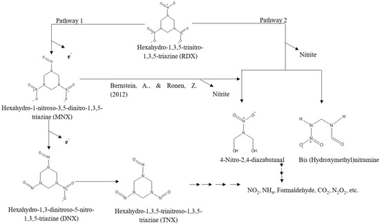 - Halasz, A.; Hawari, J. Degradation routes of RDX in various redox systems. In Aquatic Redox Chemistry, American Chemical Society; ACS Publications: Washington, DC, USA, 2011; pp. 441–462. [Google Scholar]