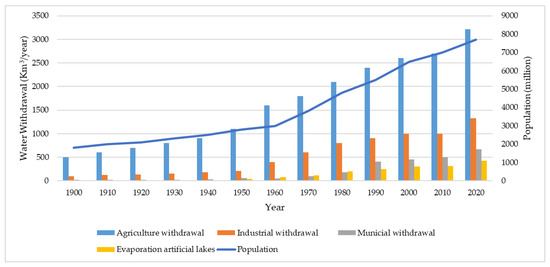 Figure 2 shows that the extraction of the water resource grows as the population increases. The volume of water lost by evaporation has augmented considerably to 400 km3/year, which may point to the rise in temperature in response to climate change. In 2020, 65% of all the volume of water withdrawn from the natural environment was used in agriculture, 23% for urban demand and the other 12% for other uses [24,25]. Figure 2 shows the positive trend in the water consumption in the different sectors each decade, increasing 600% from 1920 when the population increased 1000%.