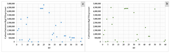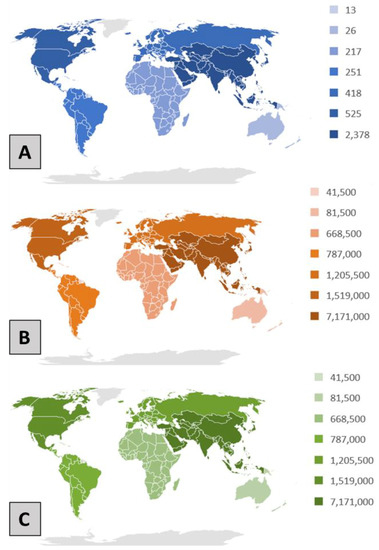 Figure 3C shows a calculated GHG emission value using the Mushtag method [61]. This procedure serves as a reference for determining the different amounts of GHG emission. Grouping the values by continent, it can be determined that Asia emits 62% of the GHG related to the use of water, having a value of 7.25 × 109 t CO2 e/year, followed in turn by North America with an emission of 1.54 × 109 t CO2 e/year, Europe with 1.22 × 109 t CO2 e/year, Latin America with 0.8 × 109 t CO2 e/year, Africa with 0.68 × 109 t CO2 e/year, Oceania with 0.09 × 109 t CO2 e/year and the Caribbean with the lowest emission value with 0.042 × 109 t CO2 e/year.