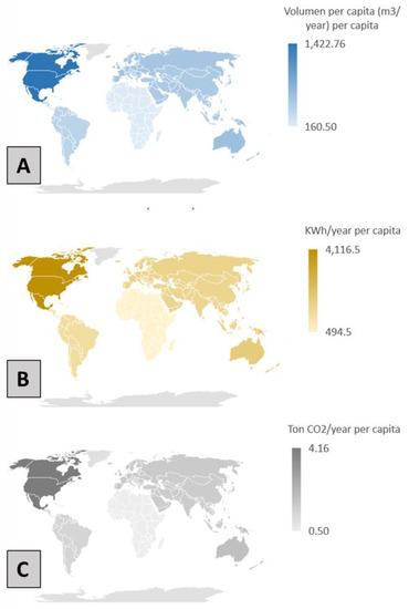Analysis per capita of indicators related to water usage. (A) Total water withdrawals (km3/year), (B) energy requirements (kW/year) and (C) GHG emission (t CO2 e/year).