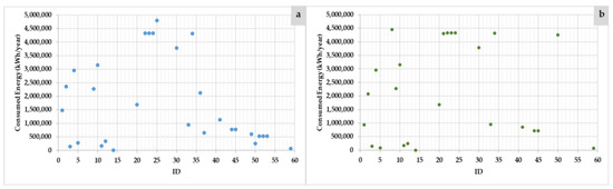 The consumption of water-related to the use of water (Figure 6) reaches values that exceed 5 × 105 MWh/year, and in the same way, there is a peak consumption value of 20 × 105 MWh/year. Unlike the initial behavior, when modifying the pressurized water supply network’s morphology, the energy consumption values remain below 1.5 × 105 MWh/year except for the peak consumption value, which is punctual, showing 4 × 105 MWh/year. By comparing the peak values, it can be determined that a reduction in energy consumption of up to 80% of the existing value in an analyzed network could be achieved by making any alteration in the network. The recurrence of high values tends to be lower in the analysis, as can be seen. The introduction of the renewable systems caused the reduction of the consumed energy in the water systems using non-renewable resources, which caused a direct decrease in the emissions as well as a decrease in exploitation costs. However, the consumed energy can also be reduced by changing the management of the water systems. An example of this reduction was published by [15] in which the management optimization reduced the energy, cost and energy footprint in 12.26%, 15.54% and 15.04%, respectively, considering that there was an increase in the distributed volume of 9.07%.