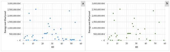 One of the main indicators used for decision-making is the monetary factor, which, as shown in Figure 8, when making changes in the operation and element that has a pressurized supply network, the annual energy cost related to water use is maintained at values below 1,500,000 €/year except for a peak value that reaches a cost of almost 40 M€/year. If the initial operating systems are maintained, the costs exceed 70 M€/year, and there is a peak value of almost 300 M€/year. Particularly, [15] reductions in operational costs decreased from EUR 0.035 to 0.029/m3, an improvement of 15.54%. However, the energy cost is linked to energy prices as well as the consumption schedule, which has a great significance when the water pressurized systems is pumped and the network is used to irrigate. In this case, it is crucial to take advantage of the off-peak hours. In pumped supply networks, the operation time is of less significance because the users’ demand is continuous, and the water manager cannot schedule the pumped operation range. Along this line, many water managers are installing renewable systems to generate green energy and disengage their connection to the grid. For these infrastructures, which combine consumption on-grid and off-grid, the best solution is the proposal of an energy management strategy for pumped hydro storage systems to manage surplus renewable energy when hybrid systems are installed [93].