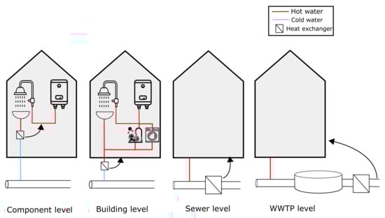 There are four main possible locations within the sewer system for energy recovery from wastewater: (i) at the component level; (ii) at building level; (iii) in the sewer pipe network, and (iv) from WWTPs. Figure 1 shows these possible options of WWHR.