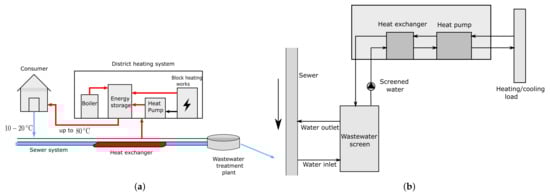 The European Union (EU) has established a target to achieve a 40% reduction in greenhouse gas (GHG) emissions (from 1990 levels), and the renewable energy share of the union should be increased to 32% of total energy generation [1]. Under the regulation on the governance of the energy union and climate action (EU/2018/1999), EU member states have established a 10-year integrated national energy and climate plan (NECP) [2]. Under these circumstances, renewable sources of energy have been of great interest in recent years. The EU Directive 2018/2001 [3] specified wastewater as a renewable heat source in compliance with the European environmental goals. Moreover, under the European Green Deal Investment Plan, member states will be provided supportive aid to implement measures like the re-use of waste heat [4].