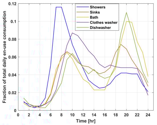 Wastewater temperature and flow rate are closely related to end-use water temperature and flow rate. If information about end-use is available, wastewater flow and temperature can be estimated based upon that. Stochastic models, such as SIMDEUM® [81], and the WaterHub framework [82], have been successfully applied to predict wastewater flow and temperature from households and buildings [82,83]. The Building America Research Benchmark Definition [84] provides a general model for end-use hot water consumption, described in Table 3. represents the number of bedrooms in the dwelling. Figure 6 depicts the hourly hot water use for each end-use as a fraction of total end-use [24].