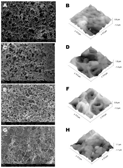 Top view SEM images (the scale bars in the images are 2 μm) and AFM 3D images (5 × 5 μm) of all the membranes: (A,B) pristine PVDF, (C,D) PVDF_0.33G, (E,F) PVDF_0.5G, (G,H) PVDF_5G, and (I,J) PVDF_10G.