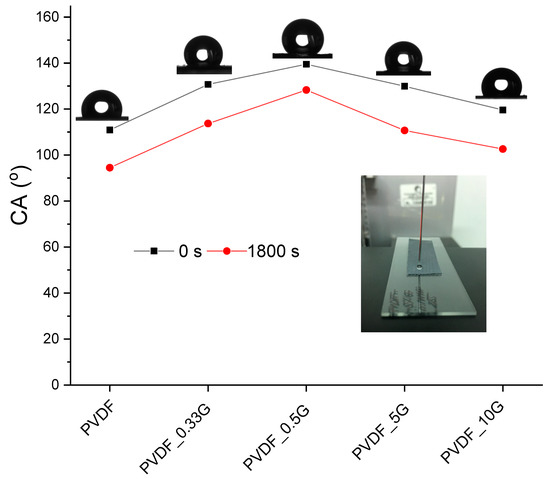 The wetting property of membranes is a crucial characteristic for MD membranes since it reduces the performance by blocking the passages of vapor [30]. Thus, the contact angle (CA) is an efficient indicator used to measure the wettability of a membrane surface; therefore, the CA values of the resulting membranes surface toward water were measured and are illustrated in Figure 2. In principle, the initial water CA values were 110.9° ± 0.7°, 130.7° ± 0.9°, 139.5° ± 1.6°, 129.9° ± 2.2°, and 119.6° ± 2.2° for pristine PVDF, PVDF_0.33G, PVDF_0.5G, PVDF_5G, and PVDF_10G, respectively. These results indicate that well-dispersed GNP in a polymeric matrix improved the hydrophobicity of the fabricated membrane. However, the presence of GNP is not enough to impart suitable hydrophobic properties. For instance, PVDF_0.5G exhibited remarkable enhancement in hydrophobicity due to the highly enhanced surface roughness, as confirmed by AFM and SEM, whereas for PVDF_10G, only a slight increase was observed. In general, the CA values followed a similar trend as the surface roughness values described in the previous section. Importantly, the change in water CA value over time was determined. As shown in Figure 2, all of the samples showed a tendency of water droplets spreading on their surface over 30 min of observation. In the case of PVDF_0.5Gparticularly, the anti-wetting properties tended to be more stable over time, as it exhibited a decrease in the water CA value by only 8% (final water CA value equal 128.3° ± 2.3°). For other samples, a reduction in the water CA value by 15%, 13%, 15%, and 14% was noted for pristine PVDF (94.5° ± 1.1°), PVDF_0.33G (113.7° ± 1.7°), PVDF_5G (110.1° ± 1.8°), and PVDF_10G (102.6° ± 2.9°), respectively. Therefore, it is likely that the PVDF_0.5G membrane was sufficient to create a water-resistant surface.